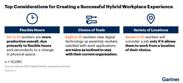 En términos generales, los colaboradores valoran cada vez más el trabajo híbrido. De acuerdo a un estudio de Gartner, las personas cada vez son más productivas cuando tienen horarios flexibles, tienen más habilidad y sacan provecho de las herramientas digitales y les gusta trabajar desde cualquier lugar.
