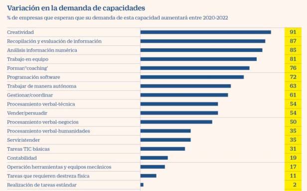 Para tener en cuenta: según un estudio de EY y Future for Work Institute las habilidades más requeridas por las empresas no son solo en manejo técnico de la tecnología, sino también las más humanas: “el 91% de las compañías espera que su demanda de esta habilidad (la creatividad) crezca entre 2020 y 2022. La recopilación y evaluación de información (87%), el análisis de información numérica (85%), el trabajo en equipo (81%) y el coaching (76%) completan la parte alta de la tabla” (Cinco Días, El País)