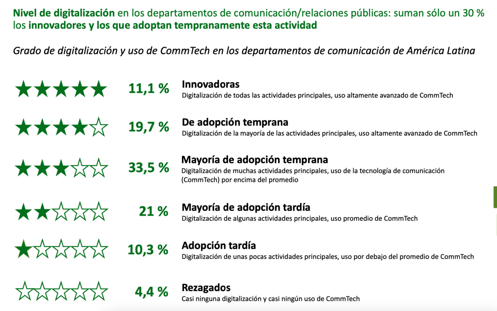Así mismo, se reconoce el desafío digital que ha traído la transformación de los entornos organizacionales, culturales y el desarrollo tecnológico. Si bien, la gestión de la información y el uso de la “big data y/o algoritmos para la comunicación son preocupaciones presentes para los y las comunicadoras en Latinoamérica, más del 35% de los encuestados consideran que sus empresas son adoptadores tardíos o rezagados en el proceso de digitalización y el uso de estas tecnologías.